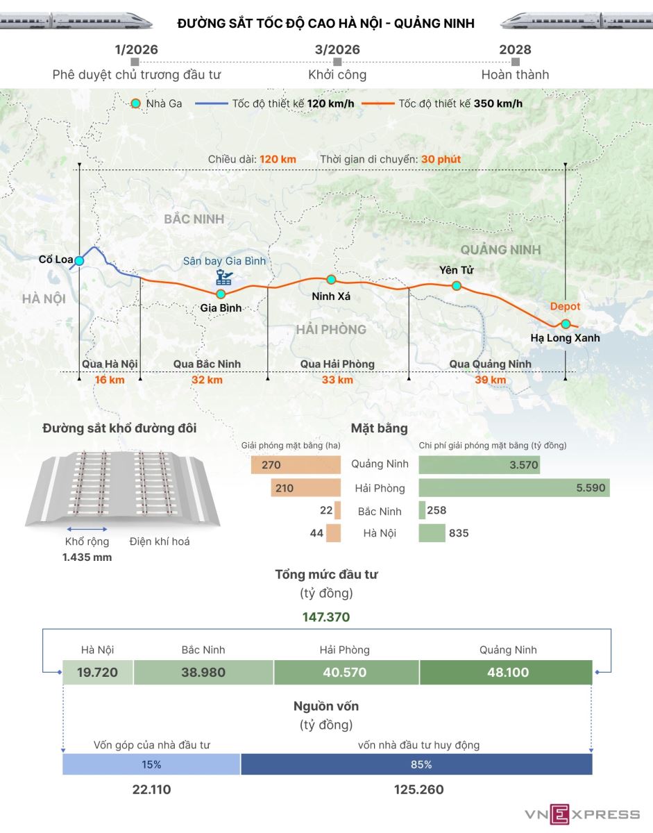 Khởi công dự án đường sắt cao tốc Hà Nội - Quảng Ninh trong tháng 3/2026 Ngày đăng : 29/01/2026 | 23 lượt xem Ngày 29/1, Ban Thường vụ Tỉnh ủy đã nghe và cho ý kiến về chủ trương đầu tư dự án Tuyến đường sắt tốc độ cao Hà Nội - Quảng Ninh và một số nội dung quan trọng khác. Đồng chí Quản Minh Cường, Ủy viên Trung ương Đảng, Bí thư Tỉnh ủy, Trưởng đoàn ĐBQH tỉnh chủ trì.